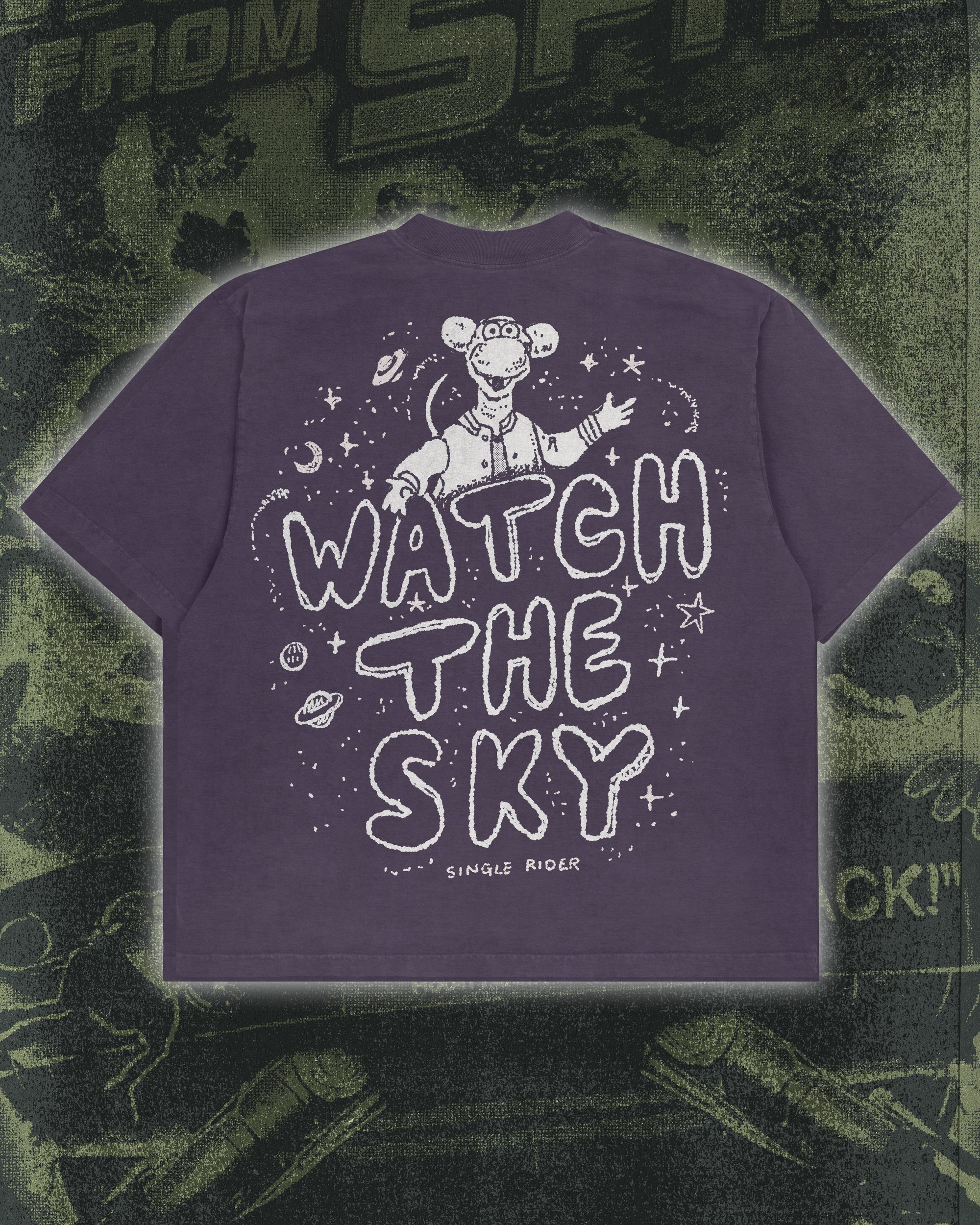 This short sleeve tee pulls from the offbeat heart of Muppets from Space—a story about feeling out of place, looking skyward, and embracing the weirdness that comes with being different. The front graphic features Gonzo mid-cosmic signal, surrounded by drifting satellites, crackling static, and hand-drawn sci-fi chaos, with the phrase “I’m sick and tired of being a one-of-a-kind freak” floating overhead. Rendered in lo-fi, vintage-leaning line-work and printed in soft white ink on a deep purple blank, the design balances humor and melancholy in a way only Gonzo can.